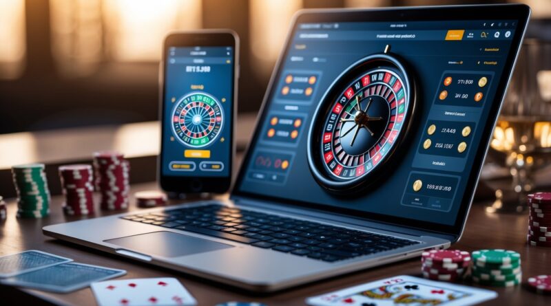 Sebuah laptop menampilkan roda roulette digital dengan chip poker dan kartu di sekitarnya, menggambarkan permainan roulette online dengan taruhan kecil.