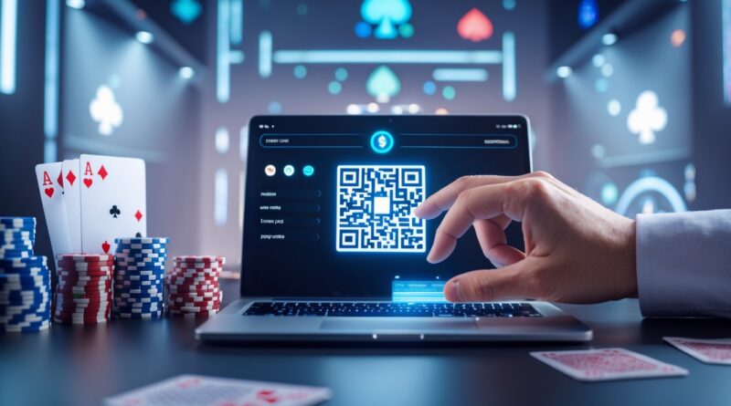 Seseorang bermain poker online menggunakan laptop dan smartphone dengan kode QR di meja kerja yang rapi.